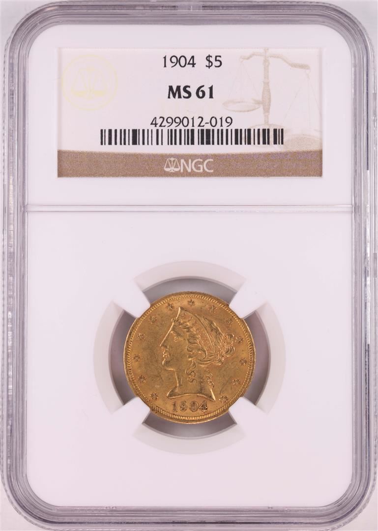 One 1904 $5 Liberty Head Half Eagle Coin NGC MS61. NGC Certified.
