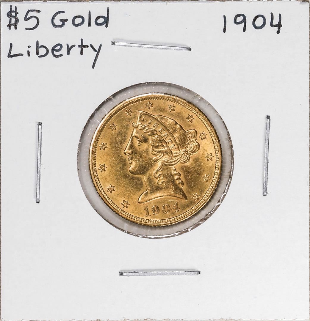 One 1904 $5 Liberty Head Half Eagle Gold Coin.