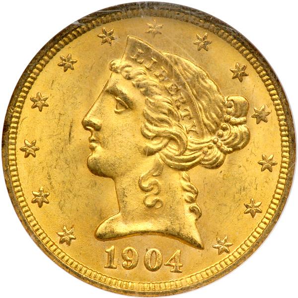 1904 $5 Liberty. NGC graded MS-65. Frosty with rich golden toning. Fully pulsating with lovely patina, gemmy frost, and the devices are free of bothersome striking incompleteness. Struck with exactitude by the dies. If physical fitness is your gospel, then this handsome 1904 half eagle is the numismatic equivalent in terms of healthy originality (PCGS # 8409) .