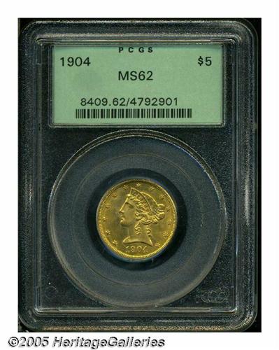 <B>1904<$5> MS62 PCGS.</B></I> A few wispy slide marks preclude a higher grade, but this sharply struck and lustrous piece has no shortage of eye appeal. Encapsulated in a green label holder.