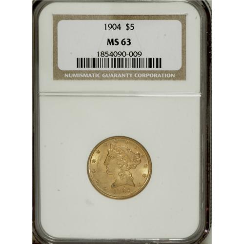 1904 $5 MS63 NGC. NGC Census: (579/371). PCGS Popu
