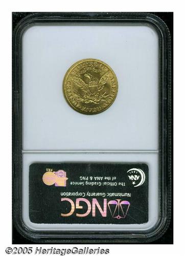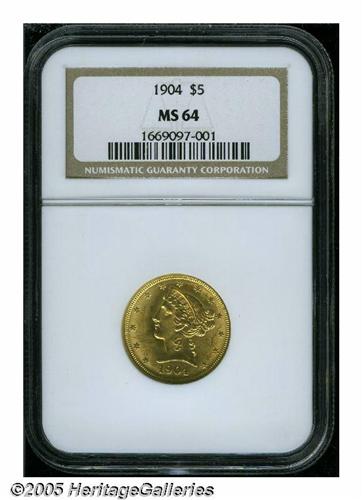 <B>1904<$5> MS64 NGC.</B></I> A lustrous and attractive example with brilliant yellow color and only a few scattered marks.