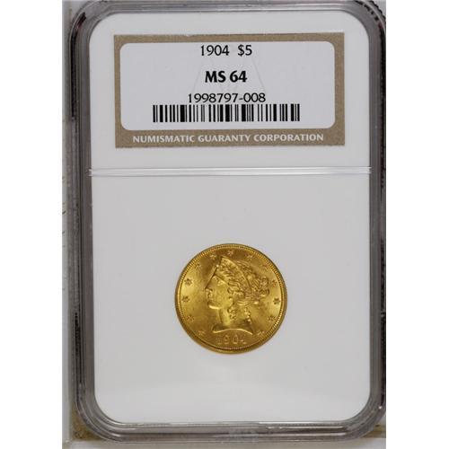 <B>1904 $5 MS64 NGC.</B></I> Choice and frosty with a few light marks on the peach-gold surfaces. The overall eye appeal is bolstered by the devices, which have bold detail.<BR><BR><b>Shipping:</b> Coin/Currency (<a target="_blank" href="http://www.heritageauctions.com/common/shipping.php">view shipping information</a>)