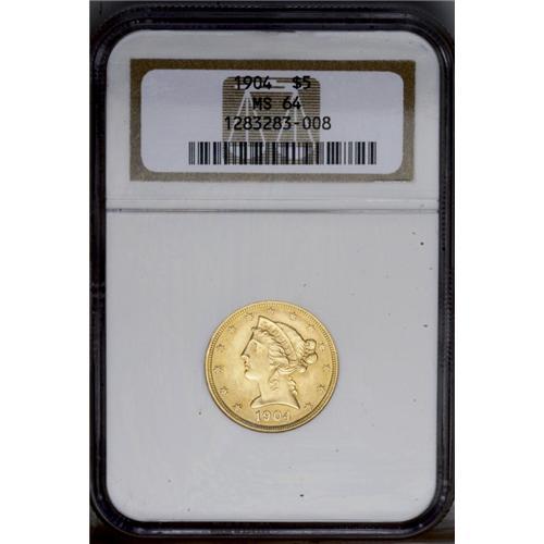 <B>1904<$5> MS64 NGC.</B></I> Vivacious cartwheel luster illuminates clean fields and unblemished devices. A suitably struck near-Gem meritorious of a high quality date and mint collection. <BR><BR><B>Important notice:</B> Heritage usually auctions material at the rate of 200-250 lots per hour. On some occasions eBay Live bid software or the Internet may not be able to keep up with the pace of the auction. We recommend placing a realistic absentee bid now as insurance to avoid disappointment. Occasionally the auctioneer may eliminate or reject an eBay Live bid, and the auctioneer may also reopen a lot after the close of the eBay live bidding (usually because we missed an audience bid), and may reject your bid even if it shows you as the winning bidder. By bidding via eBay Live, you agree that Heritage may award the lot to another bidder at its sole discretion under the circumstances described above or any other reasonable circumstances. Since eBay bids are not shown to us until we open the lot on the floor, we treat those bids just like floor bids. In most cases the floor responds before the eBay bid is presented to us, due to Internet lag time, so for consistency we have made it a policy that floor bids are always considered first over tie eBay live bids. Also please note that all Heritage lots purchased through eBay Live carry a 20% Buyer's Premium. Please make sure you read the Terms and Conditions before you bid. This lot is being auctioned in conjunction with a live floor auction by Heritage Galleries & Auctioneers. All final auction and invoice information will be supplied by Heritage Galleries & Auctioneers, and all other information should be considered preliminary. Lot:2852 <BR><BR><B>Winning Notification and Billing:</B> After the FINAL session in this auction is complete, Heritage will send e-mail and snail mail invoices. This process normally takes several days. All final auction and invoice information will be supplied by Heritage Galleries & Auctioneers, and all other information should be considered preliminary. <BR><BR>This auction will be conducted on a live auction floor and over the Internet through eBay Live. If you choose to place an absentee bid, please take a moment to <font color='#0000ff'><u><a href='http://pages.ebay.com/liveauctions/help/before/laabsentee.html'>learn how eBay Live absentee bidding works</a></u></font><font color='#000000'>