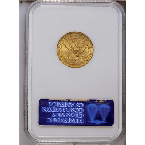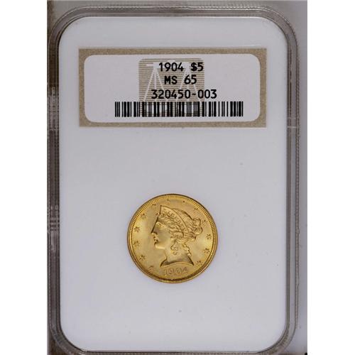 <B>1904<$5> MS65 NGC.</B></I> The 1904-P five dollar is hardly a scarcity in Mint State, but the quantity of Gem or better survivors whittles down to just a few dozen pieces. Nary a discouraging word can be said about this satiny, impeccably preserved example, save for one small abrasion near Liberty's nose and mouth. Both sides are essentially fully struck and are framed in natural olive patina. Census: 47 in 65, 21 finer (3/06).