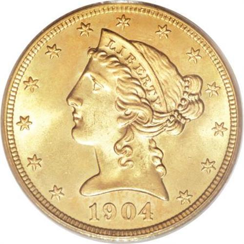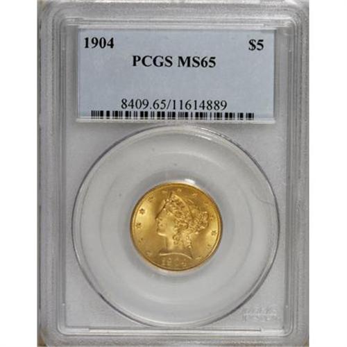 <B>1904 $5 MS65 PCGS.</B></I> Pale lime-green enriches the peripheries, while the centers are straw-gold. The strike is pinpoint-sharp, and thorough evaluation beneath a loupe locates only infrequent and inconsequential contact. The 1904 is common in MS61 to MS63 grades, but becomes scarce at the MS65 level. Population: 46 in 65, 16 finer (5/07).<BR><BR><b>Shipping:</b> Coins & Currency (<a target="_blank" href="http://www.heritageauctions.com/common/shipping.php">view shipping information</a>)