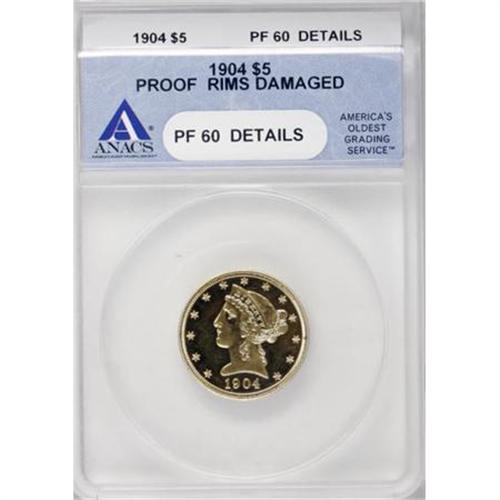 <B>1904 $5 --Rims Damaged--ANACS. PR60 Details.</B></I> Although this piece technically falls into the category of impaired proof coins, it is still a desirable rarity. The proof half eagle mintage in 1904 was only 136 coins, and current estimates suggest that about 50 to 60 of these pieces survive, at the most. It is a lovely cameo piece, and actually Gem quality except for the rim problems. The obverse rim has marks from 3 o'clock to 6 o'clock, and a few similar marks appear at various points along the reverse rim.<BR><BR><B>Coin Engraver:</B> Christian Gobrecht<BR><BR><b>Shipping:</b> Coins & Currency (<a target="_blank" href="http://www.heritageauctions.com/common/shipping.php">view shipping information</a>)