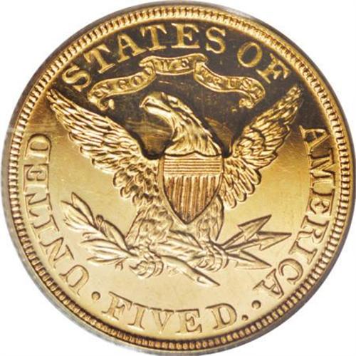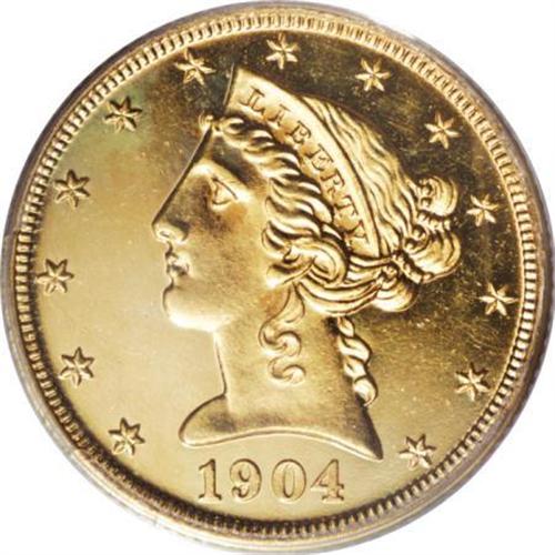 <B>1904 $5 PR63 PCGS.</B></I> Garrett and Guth point out that this issue is the "rarest from 1900 to 1907" in proof, with the lowest population numbers and the fewest number of coins appearing at auction from the time period. They note, further, that many pieces of the issue entered circulation, as impaired proofs are not uncommon. This piece displays lovely orange-gold mellowing of the surfaces on each side, and while the surfaces appear perfect to this cataloger's eyes, under a 10x loupe minuscule signs of contact appear. It is nonetheless extremely appealing, and an elusive issue to boot. Population: 4 in 63, 17 finer (8/07).<BR><BR><B>Coin Engraver:</B> Christian Gobrecht<BR><BR><b>Shipping:</b> Coins & Currency (<a target="_blank" href="http://www.heritageauctions.com/common/shipping.php">view shipping information</a>)