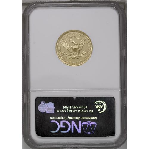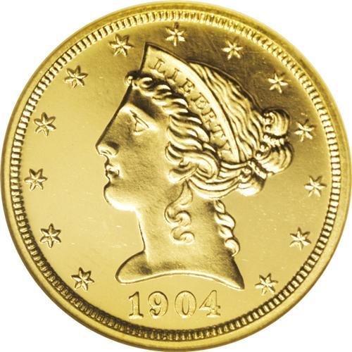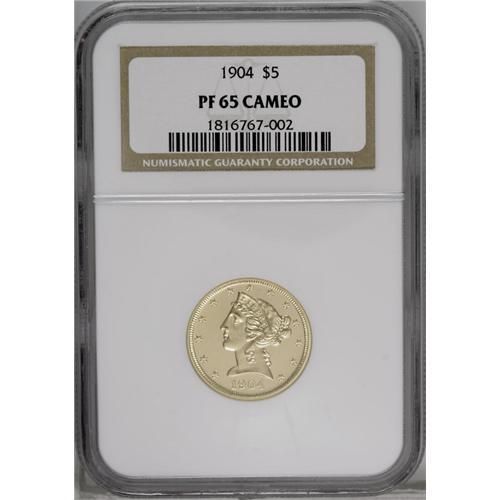<B>1904<$5> PR65 Cameo NGC.</B></I> The <I>crme de la crme</B></I> of numismatics, proof gold never ceases to find favor with connoisseurs of fine U.S. coinage. This example fully merits its Cameo designation, with limitlessly deep mirrors that endow a lush contrast with the frosty devices on both sides. Although this coin appears essentially flawless, for pedigree purposes only, a lintmark is noted at star 1. A couple of light reverse hairlines are noted under the eagle's right (facing) wing, and a pair of dotlike indentations above the eagle's neck and right wing. A true masterpiece for the collector who desires the best of the best. Census: 5 in 65, 6 finer (3/06). <BR><BR><B>Important notice:</B> Heritage usually auctions material at the rate of 200-250 lots per hour. On some occasions eBay Live bid software or the Internet may not be able to keep up with the pace of the auction. We recommend placing a realistic absentee bid now as insurance to avoid disappointment. Occasionally the auctioneer may eliminate or reject an eBay Live bid, and the auctioneer may also reopen a lot after the close of the eBay live bidding (usually because we missed an audience bid), and may reject your bid even if it shows you as the winning bidder. By bidding via eBay Live, you agree that Heritage may award the lot to another bidder at its sole discretion under the circumstances described above or any other reasonable circumstances. Since eBay bids are not shown to us until we open the lot on the floor, we treat those bids just like floor bids. In most cases the floor responds before the eBay bid is presented to us, due to Internet lag time, so for consistency we have made it a policy that floor bids are always considered first over tie eBay live bids. Also please note that all Heritage lots purchased through eBay Live carry a 20% Buyer's Premium. Please make sure you read the Terms and Conditions before you bid. This lot is being auctioned in conjunction with a live floor auction by Heritage Galleries & Auctioneers. All final auction and invoice information will be supplied by Heritage Galleries & Auctioneers, and all other information should be considered preliminary. Lot:2859 <BR><BR><B>Winning Notification and Billing:</B> After the FINAL session in this auction is complete, Heritage will send e-mail and snail mail invoices. This process normally takes several days. All final auction and invoice information will be supplied by Heritage Galleries & Auctioneers, and all other information should be considered preliminary. <BR><BR>This auction will be conducted on a live auction floor and over the Internet through eBay Live. If you choose to place an absentee bid, please take a moment to <font color='#0000ff'><u><a href='http://pages.ebay.com/liveauctions/help/before/laabsentee.html'>learn how eBay Live absentee bidding works</a></u></font><font color='#000000'>