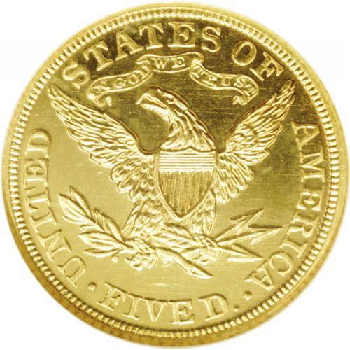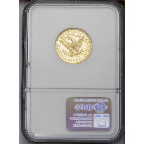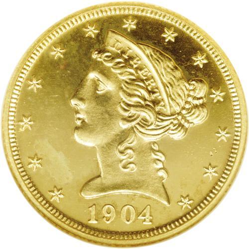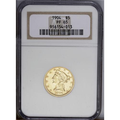 <B>1904<$5> PR65 NGC.</B></I> As a proof, the 1904 five dollar is a "common" date (if you can call it that), with 136 pieces having been struck originally. Perhaps half of that number now survive today in all grades. This deeply reflective coin features the typical non-contrasting appearance used in the proofing process after the turn of the century. The surfaces are a rich yellow-gold with only a few scattered hairlines mostly in the fields on each side, none of which are especially troubling. Close examination reveals an area of milky patina in the left obverse field. Scarce and desirable. Census: 4 in 65, none are finer (2/06).<BR><I>From The Larj Collection.</B></I>