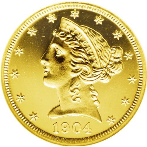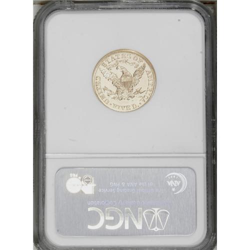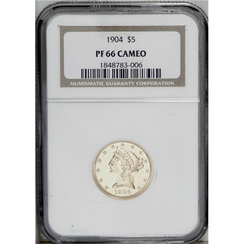 <B>1904<$5> PR66 Cameo NGC.</B></I> Both sides of this impressive Premium Gem proof have bright yellow surfaces with light cameo contrast. Although the devices are somewhat reflective, this quality deserves the Cameo designation on this early 20th century date, although it would not be called a cameo example if it was dated 10 years earlier. The reason is that the Mint changed their manner of production for proof coins in the early 20th century, and they took steps to eliminate such pieces from their production line. This example is a remarkable piece that is only exceeded by two pieces for overall quality. The 1904 has a proof mintage of 136 pieces, but the relatively high face value caused many pieces to be eventually spent by owners, heirs, and even dealers. Coin dealers often found it more convenient to deposit a gold proof at the bank than to work to sell it for the small premium over face that such pieces commanded prior to the 1940s. The mintage of 136 pieces is thus deceptively high, and the same can be said about the third party population figures, which have been inflated by two decades of resubmissions. Census: 8 in 66, 2 finer (9/06).