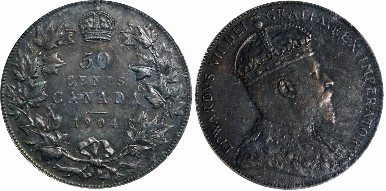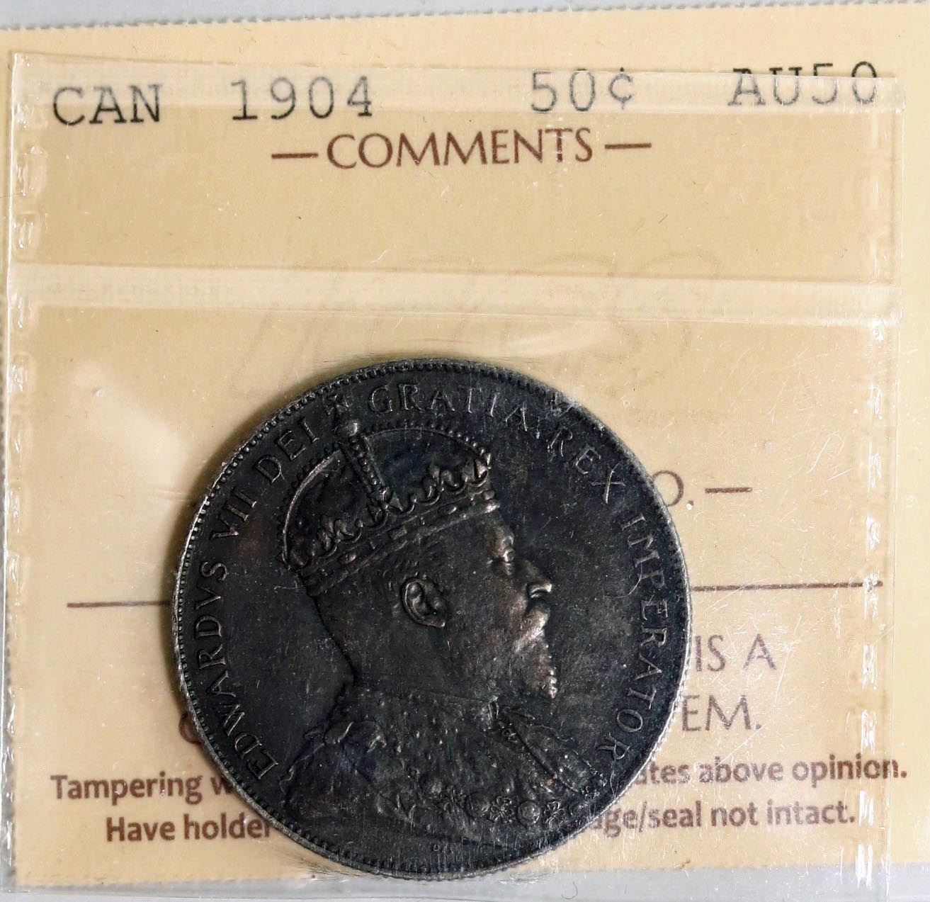 1904 50¢ ICCS About Uncirculated-50. A decent key date example displaying dee grey and blue tones.