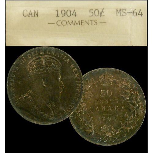 1904 50¢ ICCS MS64. A rare minstate Edwardian example and very few of this date alone. Shows strong details with absolute Gem surfaces. The coin is superbly toned and fully lustrous. . A Must See