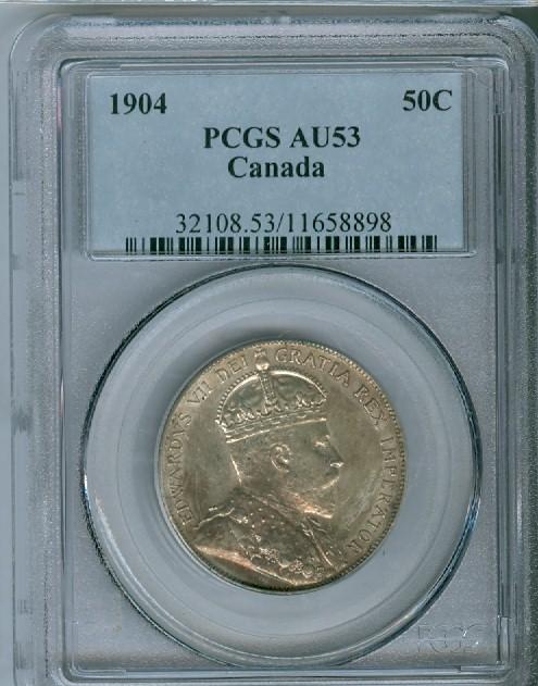 1904 50¢ PCGS AU53. White and lustrous with some light shading tone on the obverse side.
