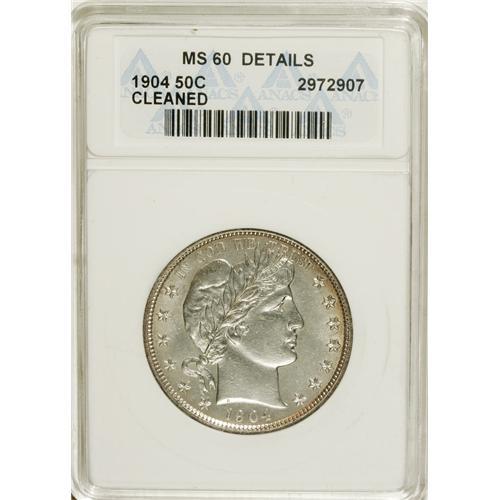 <B>1904 50C --Cleaned--ANACS. MS60 Details.</B></I> NGC Census: (0/130). PCGS Population (1/79). Mintage: 2,992,670. Numismedia Wsl. Price for NGC/PCGS coin in MS60: $417. (#6498)<BR><BR><b>Shipping:</b> Coins & Currency (<a target="_blank" href="http://www.heritageauctions.com/common/shipping.php">view shipping information</a>)