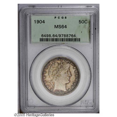 <B>1904<50C> MS64 PCGS.</B></I> This near gem Barber half exhibits nice detail on all of the devices. The surfaces possess great luster, and are visited by splotches of lavender, electric-blue, sea-green, and charcoal-gray. A few minute marks on Liberty's cheek and neck define the grade. Population: 30 in 64, 9 finer (11/05).