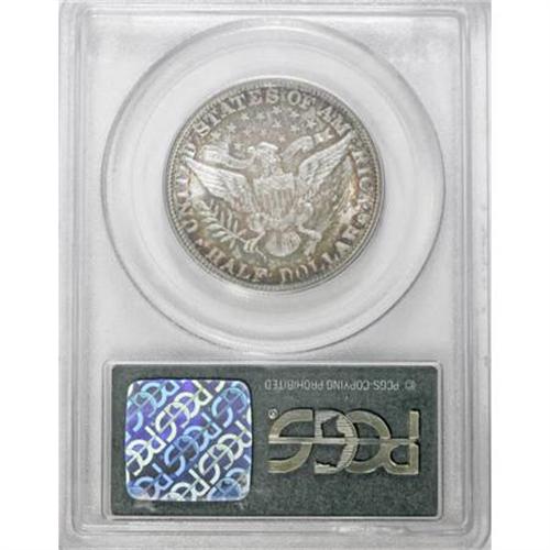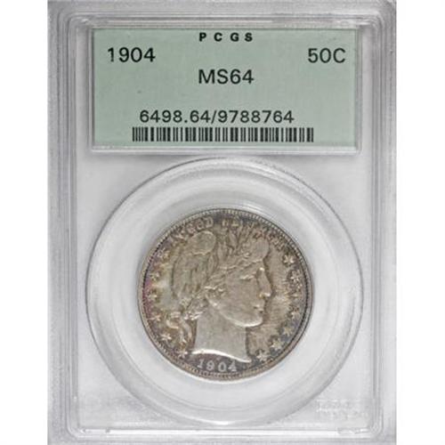 <B>1904 50C MS64 PCGS.</B></I> Splashes of lavender, electric-blue, sea-green, and charcoal-gray enrich this satiny and sharply struck older holder near-Gem. A few minute marks on Liberty's cheek and neck define the grade. Population: 55 in 64, 12 finer (12/07).<BR><BR><B>Coin Engraver:</B> Charles E. Barber<BR><BR><b>Shipping:</b> Coins & Currency (<a target="_blank" href="http://www.heritageauctions.com/common/shipping.php">view shipping information</a>)