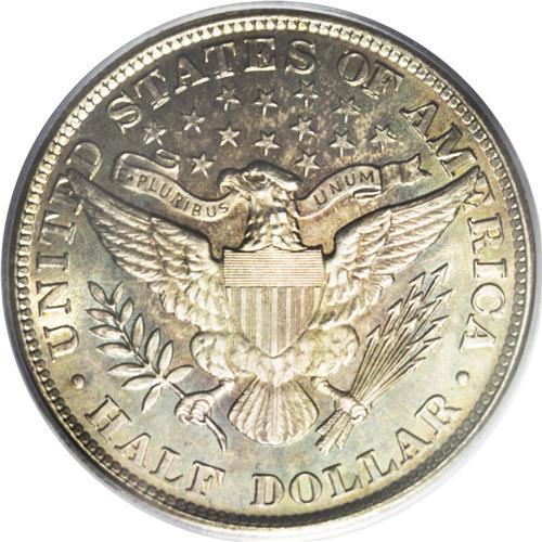 <B>1904<50C> MS65 PCGS.</B></I> Richly toned overall; a predominance of teal-blue and reddish-gold greets the viewer. Some deep crimson is seen at the center of the reverse. Fully struck and rare so fine. There are a couple of minor abrasions on Liberty's cheek, the only signs of contact readily apparent with a loupe. Despite the large mintage, few were preserved in grades that even approach the present specimen. Population: 7 in 65, 5 finer (7/06).