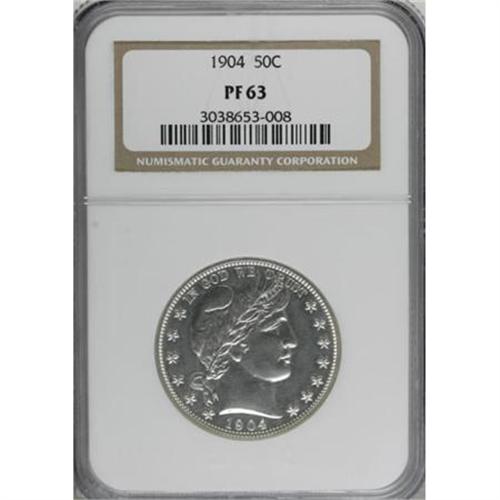 <B>1904 50C PR63 NGC.</B></I> The grade of this brilliant proof is limited by the presence of a few faint hairlines across Liberty's cheek, probably the result of a plastic slide from a modern coin album.<BR><BR><B>Coin Engraver:</B> Charles E. Barber<BR><BR><b>Shipping:</b> Coins & Currency (<a target="_blank" href="http://www.heritageauctions.com/common/shipping.php">view shipping information</a>)