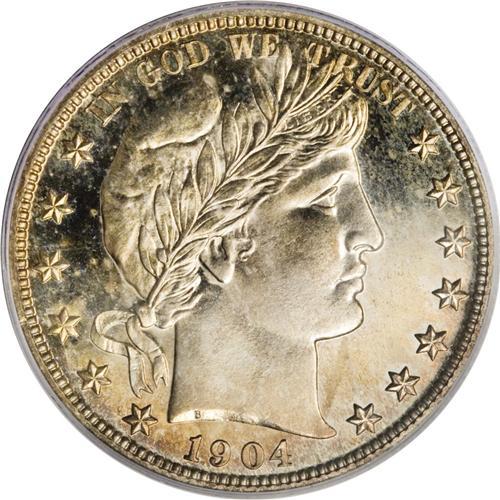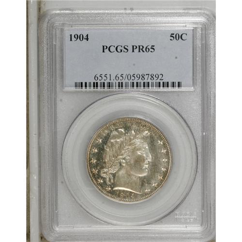 <B>1904 50C PR65 PCGS.</B></I> The 1904 half dollars come with a proof mintage of 670 pieces, a goodly number of which are extant today, based upon PCGS/NGC population/census figures. The PR65 coin in this lot displays bright surfaces that are visited by whispers of golden-tan patination. The design features are well struck, save for the usual softness in the upper right corner of the shield and adjacent wing feathers. Close examination reveals no significant marks. Population: 23 in 65, 19 finer (2/07).<BR><BR><b>Shipping:</b> Coins & Currency (<a target="_blank" href="http://www.heritageauctions.com/common/shipping.php">view shipping information</a>)