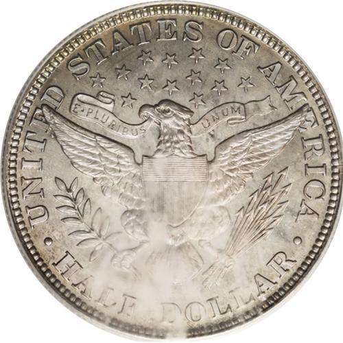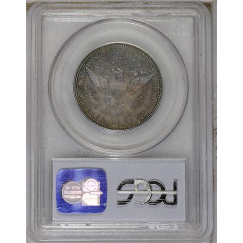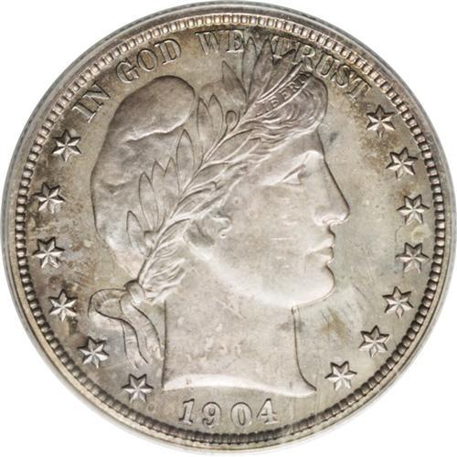 <B>1904<50C> PR66 PCGS.</B></I> This intricately struck specimen is lavishly toned powder-blue, rose-red, and lime-green. Thorough rotation and evaluation reveals only nearly imperceptible slide marks on the cheek. A prize for the toning enthusiast. A scant 670 proofs were struck. Population: 10 in 66, 8 finer (9/06).