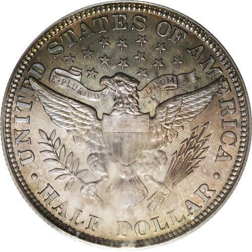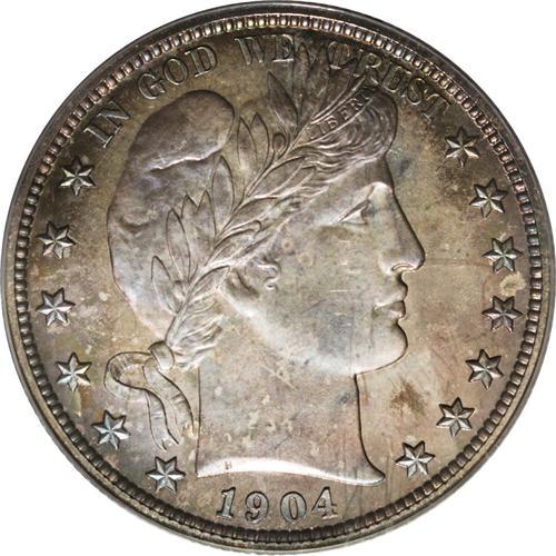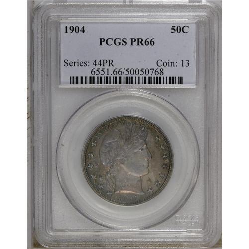 <B>1904 50C PR66 PCGS.</B></I> This intricately struck specimen is lavishly toned powder-blue, rose-red, and lime-green. Thorough rotation and evaluation reveals only nearly imperceptible slide marks on the cheek. A prize for the toning enthusiast and one of the best-preserved survivors from an original mintage of only 670 proofs. Population: 12 in 66, 8 finer (1/07).<BR><BR><b>Shipping:</b> Coins & Currency (<a target="_blank" href="http://www.heritageauctions.com/common/shipping.php">view shipping information</a>)
