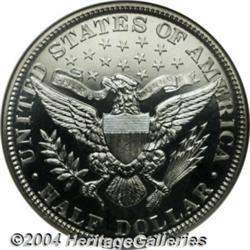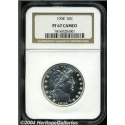 <B>1904<50C> PR67 Cameo NGC.</B></I> This is an unusual Cameo proof considering the production methods in place at the Mint in the early 1900s. Beginning in 1902, a new method of Proof production took place, with the devices in the dies being polished as well as the fields. It was believed that this would result in a more desirable appearance, as the frosted devices of Cameo example were not highly desired. Of course, today the opposite is true, and examples such as this with any Cameo contrast are highly prized. This Superb Gem is fully brilliant without toning and has very sharp design features in addition to the contrast between fields and devices. Population: 2 in 67, 1 finer (6/04). <BR><BR><B>Important notice:</B> Heritage usually auctions material at the rate of 200-250 lots per hour. On some occasions eBay Live bid software or the Internet may not be able to keep up with the pace of the auction. We recommend placing a realistic absentee bid now as insurance to avoid disappointment. Occasionally the auctioneer may eliminate or reject an eBay Live bid, and the auctioneer may also reopen a lot after the close of the eBay live bidding (usually because we missed an audience bid), and may reject your bid even if it shows you as the winning bidder. By bidding via eBay Live, you agree that Heritage may award the lot to another bidder at its sole discretion under the circumstances described above or any other reasonable circumstances. Since eBay bids are not shown to us until we open the lot on the floor, we treat those bids just like floor bids. In most cases the floor responds before the eBay bid is presented to us, due to Internet lag time, so for consistency we have made it a policy that floor bids are always considered first over tie eBay live bids. Also please note that all Heritage lots purchased through eBay Live carry a 20% Buyer's Premium. Please make sure you read the Terms and Conditions before you bid. </span></font></tr></table></td></tr></table>