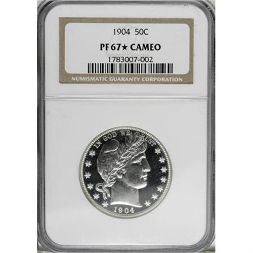 <B>1904 50C PR67 <img src="/images/star.gif" width="10" height="10" alt="" border="0"> Cameo NGC.</B></I> While we have not kept records of "orange peel toning," it is usually seen on proofs, especially gold proofs, from the 1870s, 1880s, and 1890s. To our knowledge, the exact reason for this "dry creek bed" look in the fields is not known. We believe it is from the use of non-chromium plated dies, something the mint did not start until 1927. So, it should be visible on proofs through 1907. After that time the matte finish on proofs would override the orange peel effect. <BR> This dazzling, deeply mirrored piece has strong cameo contrast on each side. There is just the slightest bit of golden color visible around the margins. As indicated by the star designation, this piece has superior eye appeal for the grade. This is the PR67 <B><img src="/images/star.gif" width="10" height="10" alt="" border="0"></B></I> certified by NGC with one <B><img src="/images/star.gif" width="10" height="10" alt="" border="0"></B></I> coin finer (11/07). <BR><BR><b>Shipping:</b> Coins & Currency (<a target="_blank" href="http://www.heritageauctions.com/common/shipping.php">view shipping information</a>)