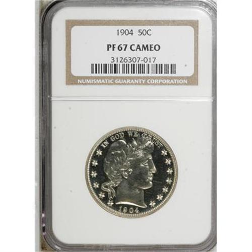 <B>1904 50C PR67 Cameo NGC.</B></I> This stone-white Superb Gem has glassy mirrored fields and icy devices. The devices exhibit consistent frost aside from a nearly imperceptible shallow strike-through on the lower cheek. A meager 670 proofs were issued. Census: 6 in 67 Cameo, 2 finer (2/08).<BR><BR><b>Shipping:</b> Coins & Currency (<a target="_blank" href="http://www.heritageauctions.com/common/shipping.php">view shipping information</a>)