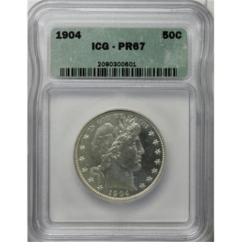 <B>1904 50C PR67 ICG.</B></I> This brilliant Superb proof displays mild field-motif contrast on both obverse and reverse. A solid strike manifests itself in sharp definition on the design features, leaving no areas incomplete. Close examination shows no mentionable marks to report. A goodly number of the 670 coins minted have survived, mostly in the PR62 to PR65 grade range. Anything finer, such as the lovely PR67 example presented in this lot, is quite elusive.<BR><I>From The Pinetop Collection.</B></I><BR><BR><B>Coin Engraver:</B> Charles E. Barber<BR><BR><b>Shipping:</b> Coins & Currency (<a target="_blank" href="http://www.heritageauctions.com/common/shipping.php">view shipping information</a>)