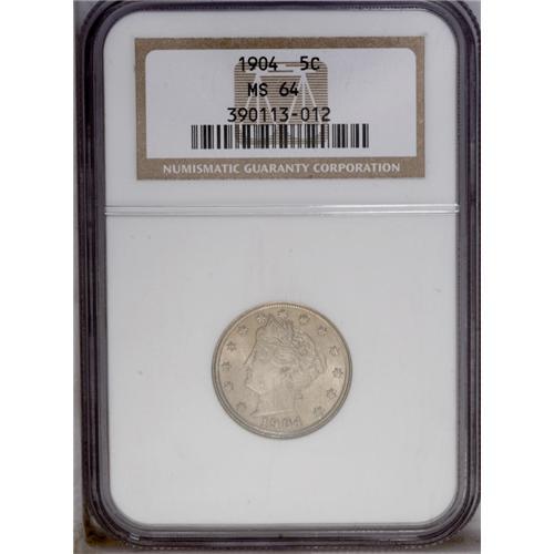 <B>1904 5C MS64 NGC.</B></I> Golden-gray surfaces exhibit coruscating luster. The design elements are sharply struck, except for weakness in some of the star centers and in the leaves and corn ear to the left of the bowknot. A couple of grade-defining marks are seen on Liberty's chin and neck.