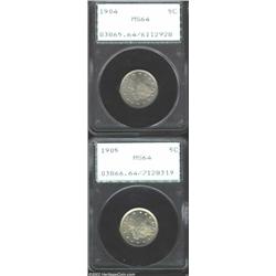 1904 5C MS64 PCGS, lustrous golden and lilac toning; and a 1905 MS64 PCGS, the mint frost is overlai