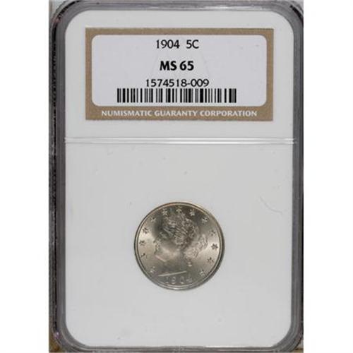 <B>1904 5C MS65 NGC.</B></I> NGC Census: (120/39). PCGS Population (145/62). Mintage: 21,404,984. Numismedia Wsl. Price for NGC/PCGS coin in MS65: $560. (#3865)<BR><BR><b>Shipping:</b> Coins & Currency (<a target="_blank" href="http://www.heritageauctions.com/common/shipping.php">view shipping information</a>)