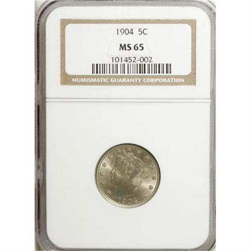 <B>1904 5C MS65 NGC.</B></I> NGC Census: (122/37). PCGS Population (154/64). Mintage: 21,404,984. Numismedia Wsl. Price for NGC/PCGS coin in MS65: $575. (#3865)<BR><BR><B>Coin Engraver:</B> Charles E. Barber<BR><BR><b>Shipping:</b> Coins & Currency (<a target="_blank" href="http://www.heritageauctions.com/common/shipping.php">view shipping information</a>)
