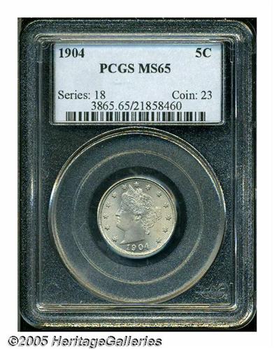 <B>1904<5C> MS65 PCGS.</B></I> A lovely Gem with fully brilliant nickel-gray color on the obverse and pale champagne toning on the reverse.