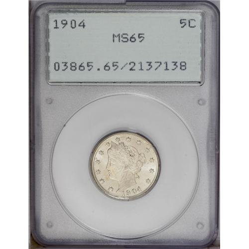 <B>1904<5C> MS65 PCGS.</B></I> Extremely brilliant and attractive surfaces, with some strike softness on the peripheral stars and a couple of small alloy spots seen under a loupe. In an older, small-size PCGS holder. PCGS has graded 51 finer (3/06). <BR><BR><B>Important notice:</B> Heritage usually auctions material at the rate of 200-250 lots per hour. On some occasions eBay Live bid software or the Internet may not be able to keep up with the pace of the auction. We recommend placing a realistic absentee bid now as insurance to avoid disappointment. Occasionally the auctioneer may eliminate or reject an eBay Live bid, and the auctioneer may also reopen a lot after the close of the eBay live bidding (usually because we missed an audience bid), and may reject your bid even if it shows you as the winning bidder. By bidding via eBay Live, you agree that Heritage may award the lot to another bidder at its sole discretion under the circumstances described above or any other reasonable circumstances. Since eBay bids are not shown to us until we open the lot on the floor, we treat those bids just like floor bids. In most cases the floor responds before the eBay bid is presented to us, due to Internet lag time, so for consistency we have made it a policy that floor bids are always considered first over tie eBay live bids. Also please note that all Heritage lots purchased through eBay Live carry a 20% Buyer's Premium. Please make sure you read the Terms and Conditions before you bid. This lot is being auctioned in conjunction with a live floor auction by Heritage Galleries & Auctioneers. All final auction and invoice information will be supplied by Heritage Galleries & Auctioneers, and all other information should be considered preliminary. Lot:949 <BR><BR><B>Winning Notification and Billing:</B> After the FINAL session in this auction is complete, Heritage will send e-mail and snail mail invoices. This process normally takes several days. All final auction and invoice information will be supplied by Heritage Galleries & Auctioneers, and all other information should be considered preliminary. <BR><BR>This auction will be conducted on a live auction floor and over the Internet through eBay Live. If you choose to place an absentee bid, please take a moment to <font color='#0000ff'><u><a href='http://pages.ebay.com/liveauctions/help/before/laabsentee.html'>learn how eBay Live absentee bidding works</a></u></font><font color='#000000'>