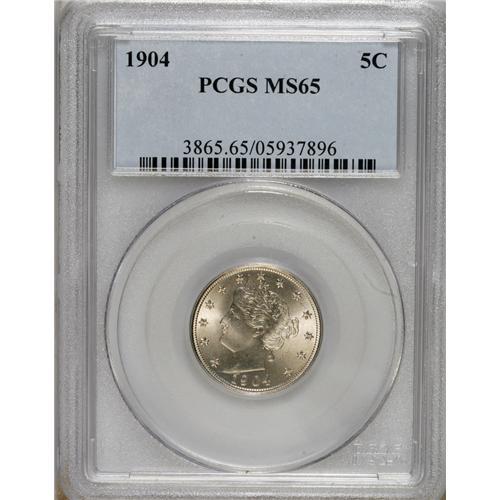 <B>1904 5C MS65 PCGS.</B></I> The silver-gray surfaces boast exuberant luster on this attractive Gem, and the strike is sharp in all areas, save for the typically weak lower left wreath. Nice for the grade.<BR><BR><b>Shipping:</b> Coins & Currency (<a target="_blank" href="http://www.heritageauctions.com/common/shipping.php">view shipping information</a>)