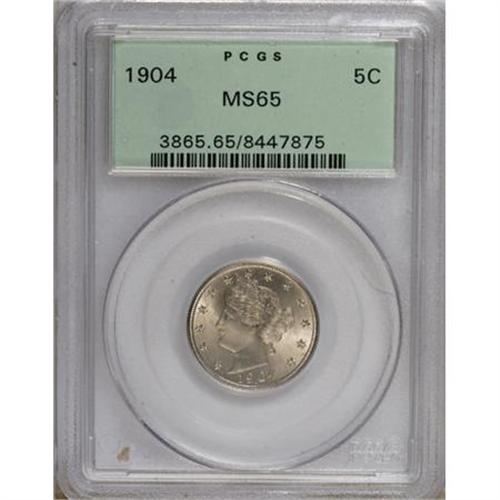 <B>1904 5C MS65 PCGS.</B></I> PCGS Population (149/61). NGC Census: (121/38). Mintage: 21,404,984. Numismedia Wsl. Price for NGC/PCGS coin in MS65: $575. (#3865)<BR><BR><B>Coin Engraver:</B> Charles E. Barber<BR><BR><b>Shipping:</b> Coins & Currency (<a target="_blank" href="http://www.heritageauctions.com/common/shipping.php">view shipping information</a>\)
