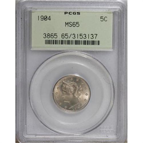 <B>1904 5C MS65 PCGS.</B></I> PCGS Population (149/61). NGC Census: (121/38). Mintage: 21,404,984. Numismedia Wsl. Price for NGC/PCGS coin in MS65: $575. (#3865)<BR><BR><B>Coin Engraver:</B> Charles E. Barber<BR><BR><b>Shipping:</b> Coins & Currency (<a target="_blank" href="http://www.heritageauctions.com/common/shipping.php">view shipping information</a>\)