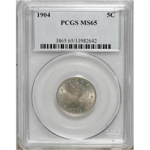 <B>1904 5C MS65 PCGS.</B></I> . PCGS Population (158/60). NGC Census: (122/36). Mintage: 21,404,984. Numismedia Wsl. Price for NGC/PCGS coin in MS65: $575. (#3865)<BR><BR><B>Coin Engraver:</B> Charles E. Barber<BR><BR><b>Shipping:</b> Coins & Currency (<a target="_blank" href="http://www.heritageauctions.com/common/shipping.php">view shipping information</a>)