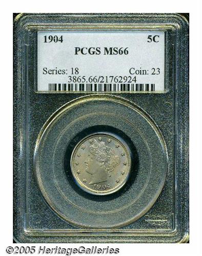 <B>1904<5C> MS66 PCGS.</B></I> Lustrous surfaces are bathed in very attractive gold-beige, ice-blue, and lavender patina. The design features are well struck throughout, and a couple of minute marks on Liberty's neck and in the upper reverse field are mentioned for accuracy. Population: 40 in 66, 0 finer (4/05).