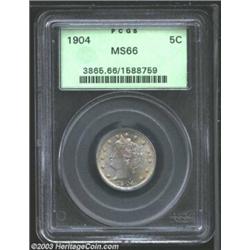 <TR><TD width="100%"><TABLE cellSpacing=1 cellPadding=3 width="100%" border=0><TBODY><TR><TD width="100%" bgColor=#79735c><FONT face=arial color=#ffffff size=3><B>Description</B> </FONT></TD></TR><TR><TD width="100%" bgColor=#ffffff><FONT face=arial size=2><B>1904 5C MS66 PCGS.</B></I> Soft blue, gold, and red tints intermingle over both sides. A well struck, fully frosty Gem example. </FONT></TD></TR></TBODY></TABLE></TD></TR></TBODY></TABLE><BR><A name=PricesRealized></A><TABLE cellSpacing=0 cellPadding=0 width="100%" bgColor=#000000 border=0><TBODY><TR><TD width="100%"><TABLE cellSpacing=1 cellPadding=3 width="100%" border=0><TBODY><TR><TD width="100%" bgColor=#79735c><A name=PR><FONT face=arial color=#ffffff size=3><B>Previous Prices from Heritage Auctions</B> </FONT></A></TD></TR><TR><TD bgColor=#f6f6ed><TABLE cellSpacing=0 cellPadding=0 width="100%" border=1><TBODY><TR><TD align=middle width="33%"><B>Date</B></TD><TD align=middle width="33%"><B>Service</B></TD><TD align=middle width="33%"><B>Price</B></TD></TR><TR bgColor=whitesmoke><TD width="33%"><B>04/22/1994</B></TD><TD width="33%">PCGS</TD><TD width="33%">$797.50</TD></TR><TR bgColor=whitesmoke><TD width="33%"><B>01/04/2000</B></TD><TD width="33%">NGC</TD><TD width="33%">$605.00</TD></TR><TR bgColor=whitesmoke><TD width="33%"><B>03/01/2003</B></TD><TD width="33%">NGC</TD><TD width="33%">$747.50</TD></TR></TBODY></TABLE></TD></TR><TR><TD bgColor=#ffffff><FONT face=arial size=1 ?>PLEASE NOTE: All prices realized reflect the final hammer price PLUS the buyer's premium in auctions that charge a buyer's premium. Each item has a notation at the top of the listing indicating whether that lot included a buyer's premium. Example: A item that sells with a final hammer price of $100 and a 20% buyer's premium will display with a price realized of $120. All information listed is intended to be as accurate as possible, but errors are possible. Please use this guide carefully and inform us of any inaccuracies. </FONT></TD></TR></TBODY></TABLE></TD></TR></TBODY></TABLE><BR><TABLE cellSpacing=0 cellPadding=0 width="100%" bgColor=#000000 border=0><TBODY><TR><TD width="100%"><TABLE cellSpacing=1 cellPadding=3 width="100%" border=0><TBODY><TR><TD width="100%" bgColor=#79735c colSpan=6><FONT face=arial color=#ffffff size=3><B>Price Guide*</B> </FONT></TD></TR><TR bgColor=#f6f6ed><TD align=middle><B>Grade</B> </TD><TD align=middle><B>Coin World<BR>(Trends)</B> </TD><TD align=middle><B>Numismedia<BR>Retail</B> </TD><TD align=middle><B>Numismedia<BR>Wholesale</B> </TD><TD align=middle><B>Coin<BR>Universe</B> </TD><TD align=middle><B>Heritage<BR>Value Index</B> </TD></TR><TR bgColor=#ffffff><TD align=middle>65</TD><TD align=right>$525.00</TD><TD align=right>$495.00</TD><TD align=right>$396.00</TD><TD align=right>$750.00</TD><TD align=right>$492.38</TD></TR><TR style="FONT-WEIGHT: bold" bgColor=#cccfdd><TD align=middle>66</TD><TD align=right>$1,200.00</TD><TD align=right>---</TD><TD align=right>$950.00</TD><TD align=right>$1,950.00</TD><TD align=right>$1,060.00</TD></TR><TR bgColor=#ffffff><TD align=middle>67</TD><TD align=right>---</TD><TD align=right>---</TD><TD align=right>---</TD><TD align=right>---</TD><TD align=right>---</TD></TR><TR bgColor=#ffffff><TD colSpan=6><FONT size=1>*All information listed is intended to be as accurate as possible, but errors are possible. No item may be returned or refused based on this information which is provided as a service to our customers. You should contact each pricing source directly to determine the accuracy of this information. </FONT></TD></TR></TBODY></TABLE></TD></TR></TBODY></TABLE><BR><TABLE cellSpacing=0 cellPadding=0 width="100%" bgColor=#000000 border=0><TBODY><TR><TD width="100%"><TABLE cellSpacing=1 cellPadding=3 width="100%" border=0><TBODY><TR><TD width="100%" bgColor=#79735c><FONT face=arial color=#ffffff size=3><B>Population Guide</B> </FONT></TD></TR><TR bgColor=#ffffff><TD align=middle><!-- Begin Output of Population Grid--><TABLE cellSpacing=0 cellPadding=0 width="100%" border=0><TBODY><TR><TD vAlign=center><TABLE cellSpacing=0 width="100%" border=1 cellsadding="3"><TBODY><TR><TD vAlign=center><TABLE cellSpacing=0 cellPadding=3 width="100%" border=1><TBODY><TR><TD vAlign=center align=middle bgColor=#f0f1e8 colSpan=2 <CENTER><FONT face=Arial size=2><B>PCGS Pop </B></FONT><CENTER></CENTER></TD><TD vAlign=center align=middle bgColor=#f0f1e8 colSpan=2><CENTER><FONT face=Arial size=2><B>NGC Pop</B></CENTER></FONT></TD></TR><TR><TD vAlign=center><FONT face=Arial size=2>(66)</FONT> </TD><TD vAlign=center align=right><FONT face=Arial size=2>27</FONT> </TD><TD vAlign=center><FONT face=Arial size=2>(66)</FONT> </TD><TD vAlign=center align=right><FONT face=Arial size=2>26</FONT> </TD></TR><TR><TD vAlign=center><FONT face=Arial size=2>(>66)</FONT> </TD><TD vAlign=center align=right><FONT face=Arial size=2>0</FONT> </TD><TD vAlign=center><FONT face=Arial size=2>(>66)</FONT> </TD><TD vAlign=center align=right><FONT face=Arial size=2>2</FONT> </TD></TR></TBODY></TABLE></TD></TR></TBODY></TABLE></TD></TR></TBODY></TABLE><!-- End Output of Population Grid--></TD></TR></TBODY></TABLE></TD></TR></TBODY></TABLE><BR><TABLE cellSpacing=0 cellPadding=0 width="100%" bgColor=#000000 border=0><TBODY><TR> Important notice: We expect to be auctioning lots at the rate of 200-250 per hour. On occasion eBay live bid software cannot keep up with the pace of the auctions where 4-5 lots per minute can hammer down, so we recommend that you place a realistic absentee bid now as insurance to avoid disappointment. Also please note that all Heritage/CAA lots purchased through eBay Live carry a 20% Buyer's Premium. Please make sure you read the Terms and Conditions.