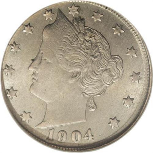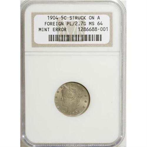 <B>1904 5C Liberty Nickel--Struck on a Foreign Planchet--MS64 NGC.</B></I> 2.76 gm. The planchet appears to be copper-nickel. It is too heavy to be for a 1903 Costa Rica two centimos, and too light to be for a Philippines five centavos. Softly struck, as expected for an underweight planchet, and uncentered toward 9:30. Light chestnut and pearl-gray toning enriches the smooth and lustrous surfaces.<BR><BR><B>Coin Engraver:</B> Charles E. Barber<BR><BR><b>Shipping:</b> Coins & Currency (<a target="_blank" href="http://www.heritageauctions.com/common/shipping.php">view shipping information</a>)