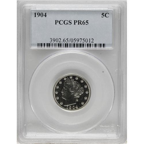 <B>1904 5C PR65 PCGS.</B></I> Fully struck and brilliant, with deeply reflective fields and remarkably preserved surfaces overall. A visually enticing Gem proof Liberty nickel.<BR><BR><b>Shipping:</b> Coins & Currency (<a target="_blank" href="http://www.heritageauctions.com/common/shipping.php">view shipping information</a>)