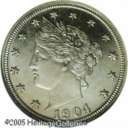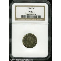 <B>1904 5C PR67 NGC.</B></I> In their book <I>The Complete Guide to Shield and Liberty Head Nickels,</B></I> Peters and Mohon state that: "Only in PR63 can this proof be considered common. Carbon spotting, streaks and mishandling continue to be a problem for proofs and business strikes in this series." The scarcity of this issue is evident from the combined NGC and PCGS population figures of only 14 specimens certified at the PR67 grade level, with none higher. (1/05). Moreover, the exceptionally well preserved surfaces are completely devoid of blemishes of any kind, and radiate a near-blinding brilliance, with just a few whispers of faint golden-brown and powder-blue toning. This piece possesses exceptional overall eye appeal. Population: 11 in 67, 0 finer (1/05). Lot:5942