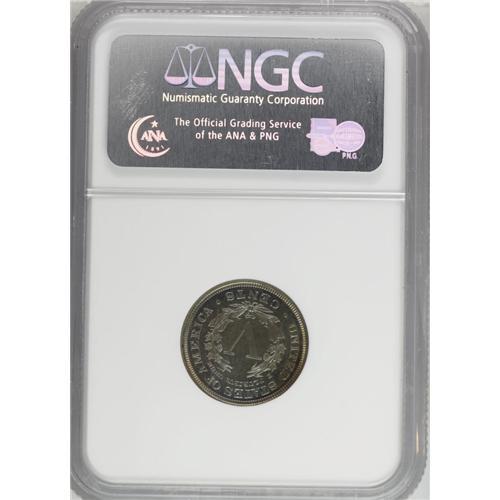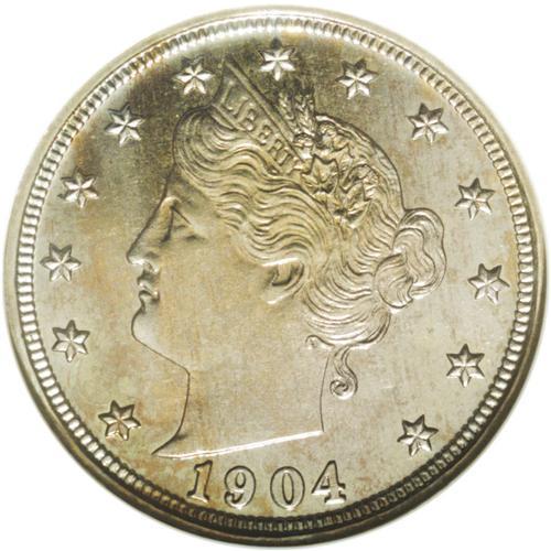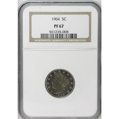 <B>1904<5C> PR67 NGC.</B></I> In their book <I>The Complete Guide to Shield and Liberty Head Nickels,</B></I> Peters and Mohon state that: "Only in PR63 can this proof be considered common. Carbon spotting, streaks and mishandling continue to be a problem for proofs and business strikes in this series." The scarcity of this issue is evident from the combined NGC and PCGS population figures of only 14 specimens certified at the PR67 grade level, with none higher. (7/06). Moreover, the exceptionally well preserved surfaces are completely devoid of blemishes of any kind, and radiate a variegated mixture of antique-gold and ice-blue patina. This piece possesses exceptional overall eye appeal. Population: 11 in 67, 0 finer (1/05).