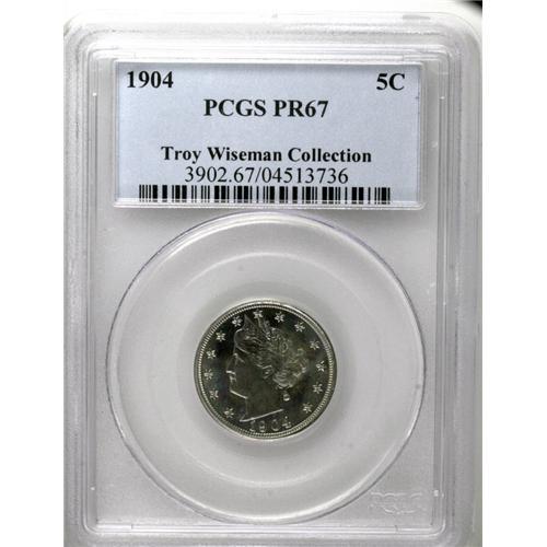 <B>1904<5C> PR67 PCGS.</B></I> The centers are pale lilac and heather, with tinges of translucent aqua and gold at the rims. The blazing luster complements a nearly full strike, save perhaps for a suggestion of softness on portions of the wreath. All star centrils are full, and the hair is sharply articulated. Population: 3 in 67, 0 finer (8/06).<BR><I>From The Troy Wiseman Collection.</B></I>