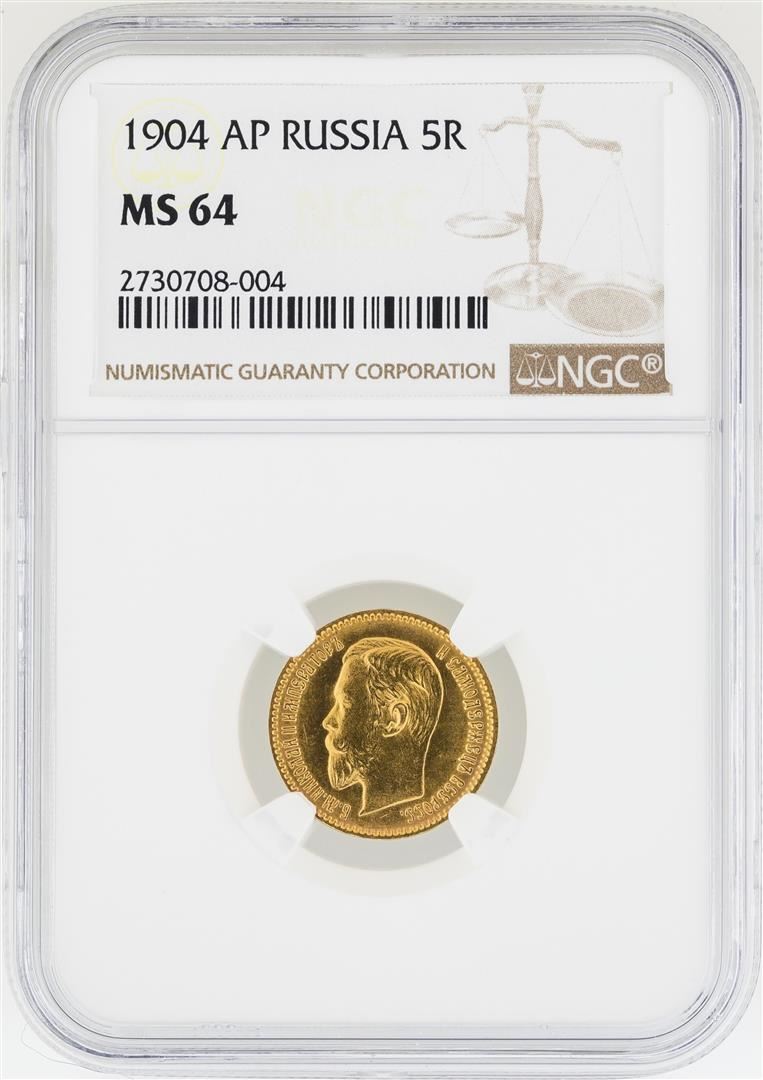 One 1904-AP Russia 5 Roubles Gold Coin NGC MS64. NGC Certified.