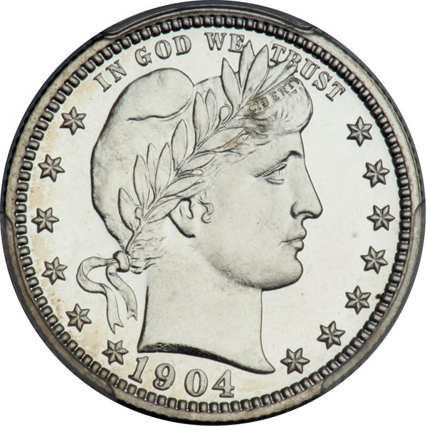 1904 Barber Quarter Dollar. PCGS graded Proof 66. Only 670 minted. A flashy white gem. A worldly measure of pouring healthy luster livens up the wide expanse of mirror surface here. The fields are for all intents and purposes immaculate, while the strike is intrepid enough to call for special mention. Like others in this period (1901-04) the Proof dies left behind an "all brilliant" finish in the fields as well as on the devices. Pop 25; 10 finer in 67 (PCGS # 5690) .