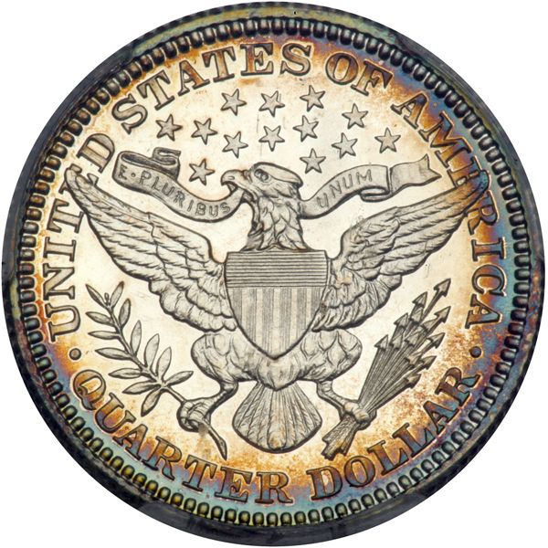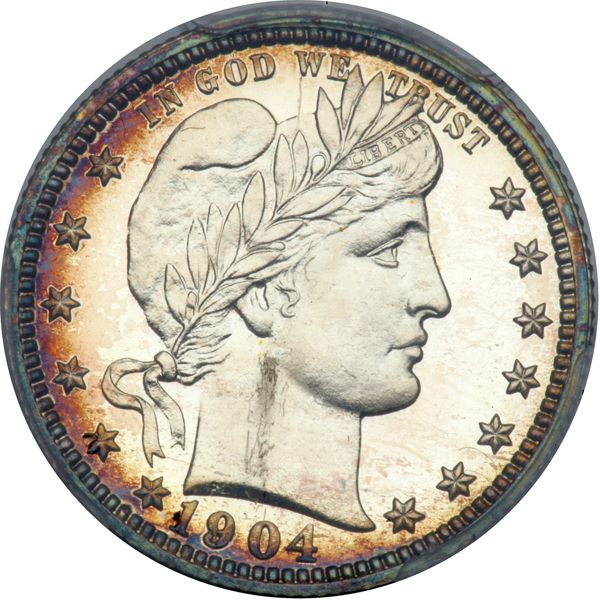 1904 Barber Quarter Dollar. PCGS graded Proof 65+ Cameo PQ CAC Approved. Mostly white with rainbow toning around the edges. Frosty fields blessed with highly reflective luster. The more matte designs stand out nicely against this brilliance in cameo relief. All original, squarely within the Gem class. And so to the next qualification, the strike. Here we see exceptionally fine detail with not even minor weakness to the sharp centers. Only 670 Proofs struck. Pop 1; 7 finer, 4 in 66, 2 in 67, 1 in 68 (PCGS # 85690) .